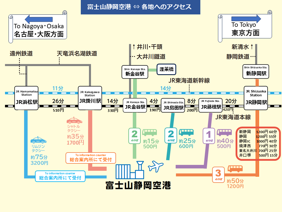 空港から県内各地へのアクセス方法 お気に入りに登録する [印刷ボタン機能]JavaScript推奨 ご希望のアクセス方法をお選びください。 ページ内目次 島田・藤枝・焼津・静岡方面 伊豆方面 沼津・三島・御殿場方面 富士・富士宮方面 奥大井・寸又峡方面 掛川・袋井・磐田・浜松方面 島田・藤枝・焼津・静岡方面 ページの先頭へ戻る 伊豆方面 ページの先頭へ戻る 沼津・三島・御殿場方面 ページの先頭へ戻る 富士・富士宮方面 ページの先頭へ戻る 奥大井・寸又峡方面 ページの先頭へ戻る 掛川・袋井・磐田・浜松方面 交通アクセス 空港へのアクセス方法 空港から県内各地へのアクセス方法 バス・電車 乗合タクシー タクシー レンタカー 駿河湾フェリー 空港から主要都市へのアクセス方法 空港から県内観光地・施設へのアクセス方法 ガソリンスタンドのご案内 PR)旅CUBE