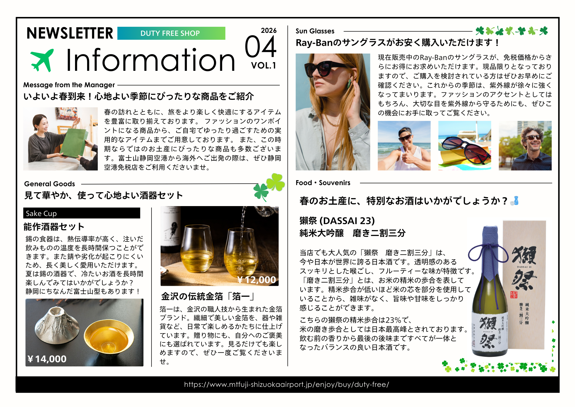 免税品(お酒、煙草、化粧品、有名ブランド菓子等)や静岡土産等を販売しております。ご出発前のショッピングをお楽しみください。