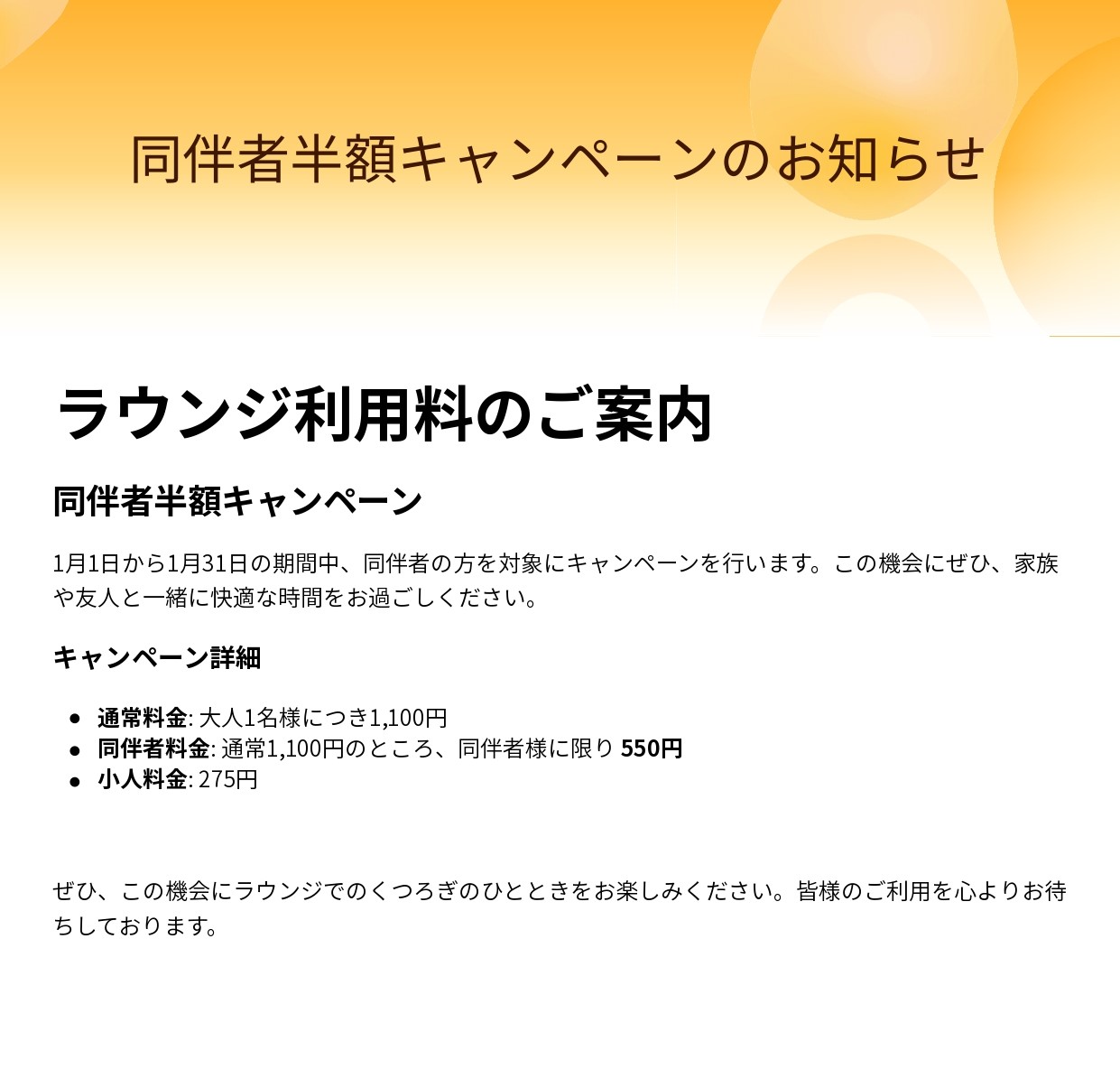 ラウンジからキャンペーンのお知らせ ※実施期間:1/1~1/31