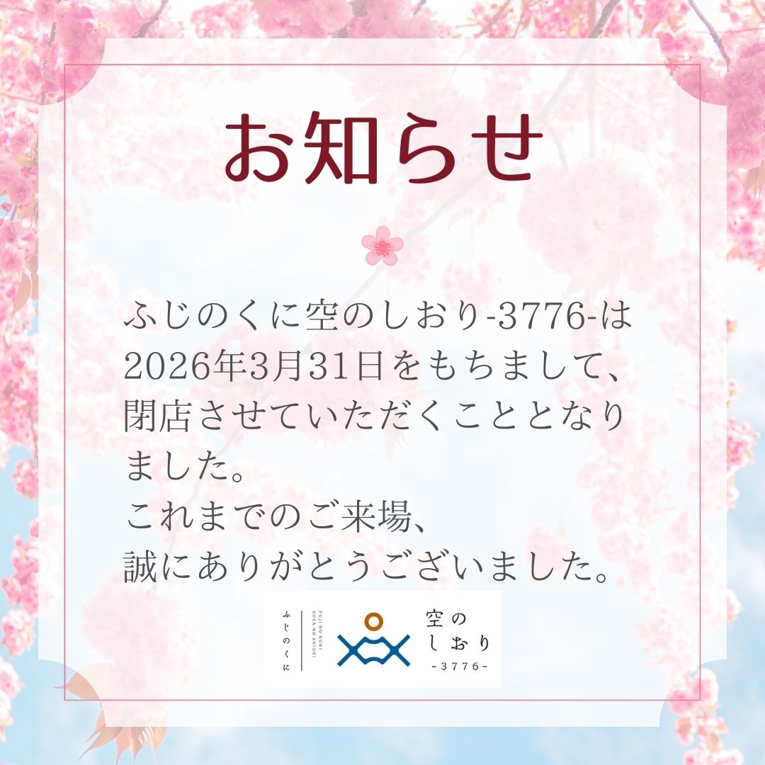 【ふじのくに空のしおり-3776-】は閉店させていただくこととなりました。これまでご来場いただきましたお客様には、心より感謝申し上げます。