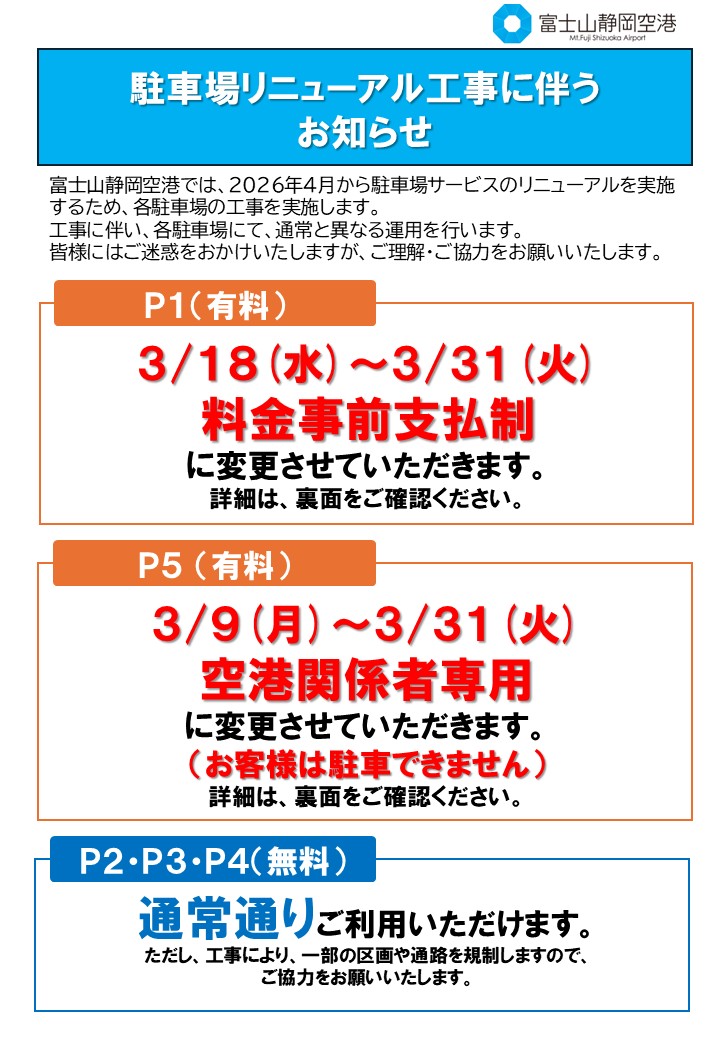 富士山静岡空港では、2026年4月から駐車場サービスのリニューアルを実施するため、各駐車場の工事を実施します。