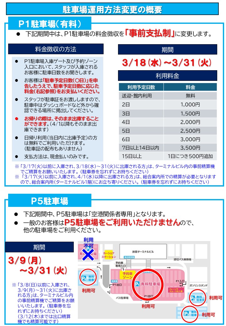 ホーム > 空港からのお知らせ > リニューアル工事に伴う駐車場運用方法一部変更のお知らせ(3/9~3/31)