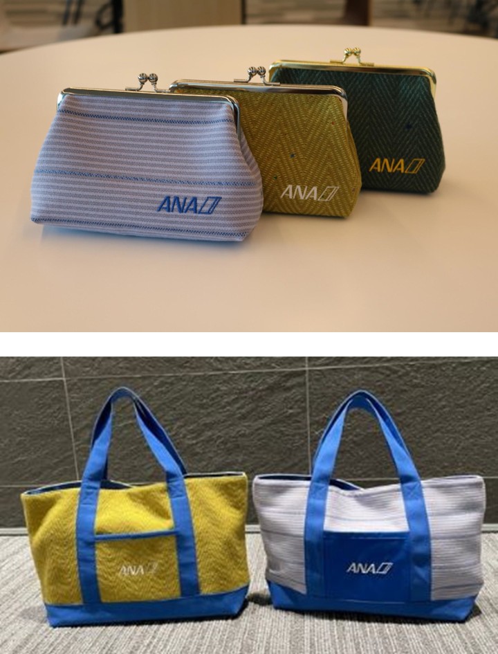 北海道や沖縄行きの飛行機が人気のANA。飛行機のシートの生地などをリサイクルしたオリジナル商品も販売します。